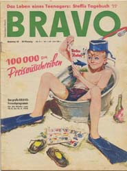 JugendmagazineIn den 50er und 60er Jahren begann sich die Generation der Teenager in bisher nicht gekannter Weise von den Konventionen der Erwachsenen zu emanzipieren und eigene Jugendkulturen zu entwickeln. Das Jugendmagazin 'Bravo' ist ein Spiegelbild dieser Entwicklung. Natürlich war auch dieses Druckerzeugnis- obwohl es aus heutiger Sicht sehr 'brav' wirkt- den 'Jugendschützern', die sich bemühten, den Jugendlichen traditionell- konservative Werte einer ausgeprägt hierarchischen Gesellschaft zu vermitteln, ein Ärgernis. Auch rechtliche Schritte, die von Jugendschützern gegen dieses Magazin unternommen wurden, konnten seine weite Verbreitung nicht hindern. Magazine dieser Art entzogen aber den Kinderzeitungen, die im Vergleich dazu 'kindisch' wirkten, einen Großteil der älteren Leserschaft. |
