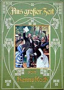 Links: Aus großer Zeit – Eine Erzählung für junge Mädchen von Henny Koch, Deutschland,1908: Vor dem Hintergrund des deutsch-französischen Krieges wird in einer nach heutigem Empfinden unglaublich schwülstigen, damals aber zeitgemäßen Sprache als nachahmenswertes Beispiel beschrieben, wie es junge Frauen mit Stolz erfüllt, wenn ihre Verlobten in den Krieg ziehen und wie sie von patriotischen Gefühlen beseelt ihre Kinder zur treuen Vaterlandsliebe erziehen. Dieses Buch ist eine unverhohlene Einstimmung für den nächsten Krieg, von dessen Ausmaßen man sich damals noch keine Vorstellung machte. |