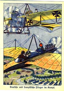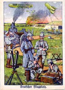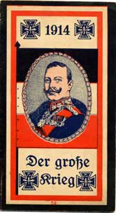 Neben der zurückhaltenden offiziellen Propaganda gab es aber auch eine private, durchaus kommerziell orientierte Propaganda, die sich die Kriegsbegeisterung und die patriotischen Gefühle weiter Bevölkerungskreise zunutze machte und teilweise überaus aggressiv war (Oben: Postkartenparolen vom Beginn des ersten Weltkrieges). Diese private Kriegspropaganda machte auch vor Kindern nicht halt. |