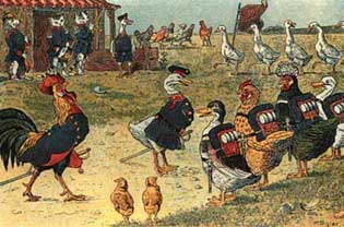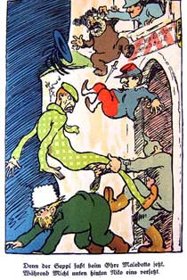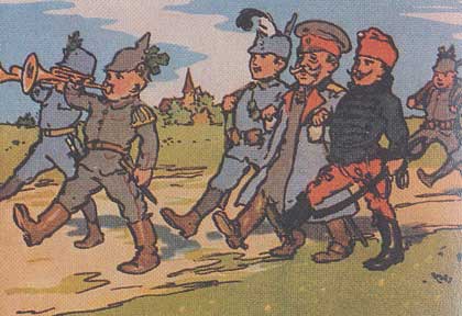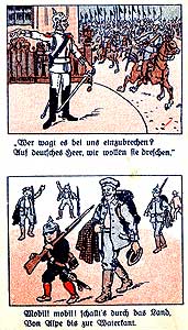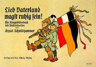 Das wohl bekannteste und in der nachträglichen Beurteilung eines der am meisten kritisierten Kriegsbilderbücher jener Zeit ist Lieb Vaterland magst ruhig sein! von Arpad Schmidhammer. Dieses Bilderbuch versucht in einfachster Form den Kindern - und wohl auch den Erwachsenen, die es ihren Kindern vorlasen - Ursachen und Ziele des Krieges verständlich zu machen: Der Michl (Deutschland) und der Seppl (Österreich) bestellen ganz friedlich ihren Blumengarten. Aber der Nachbarknabe Lausewitsch (Serbien) hört nicht auf, den Seppl zu sekkieren und vertraut darauf, dass ihm sein großer Bruder Nikolaus (Russland) mit dem Prügel zu Hilfe kommt. Es entwickelt sich eine Art Massenkeilerei, an deren Ende die Feinde verdroschen werden und die beiden Knaben wieder friedlich ihr Gärtlein bestellen können. |