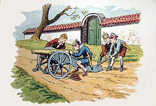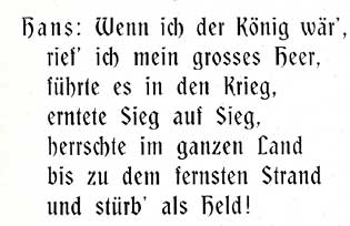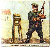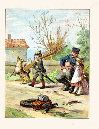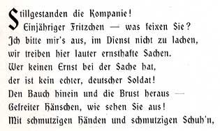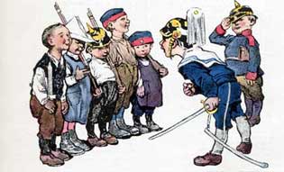Man findet nur wenige Beispiele im Kinderbuch jener Zeit, die diese Verherrlichung des Militärs mit kritischer Distanziertheit behandeln. Im Bilderbuch mochte so etwas noch angehen; in der Jugendliteratur herrschte hingegen durchgehend patriotischer Ernst. |