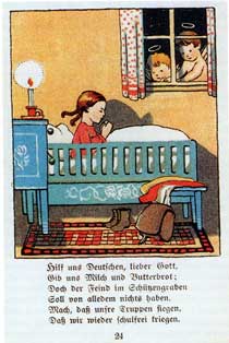 Propagandapostkarten aus dem ersten Weltkrieg: Kinder als Vermittler der Propaganda: Dabei geht es darum, durch kindergerechte Produkte eine Propagandabotschaft an die Erwachsenen zu vermitteln. Es handelt sich um einen ähnlichen Mechanismus, wie jenen, der in der Produktwerbung unter dem Schlagwort 'Kinder als Kaufmotivatoren' beschrieben wird. Der Unterschied besteht lediglich darin, dass im Umweg über das Kind nicht für ein bestimmtes Produkt, sondern für eine bestimmte Ideologie geworben wird. Beispiele dafür sind die Kriegsbilderbücher des ersten Weltkrieges. Bei Kriegsbilderbüchern, die sich an kleine Kinder richten, wird deren propagandistische Beeinflussung wohl sekundär sein. Ziel ist es vielmehr, mit der transportierten Botschaft die Erwachsenen zu erreichen, die diese Bücher kaufen, ihren Kindern vorlesen und erklären und sich dadurch letztlich zur Notwendigkeit des Krieges bekennen. |