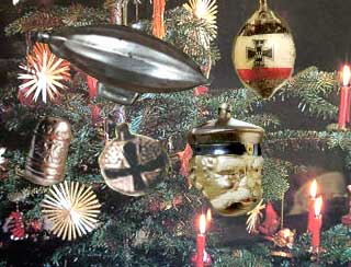 Aber auch der reale Christbaum wurde mit Kriegsdevotionalien geschmückt. Da gab es beispielsweise (Bild links) Hoheitszeichen, Granaten, Zeppeline oder Soldaten. |