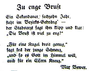 Das Gedicht links stammt von dem seinerzeit recht bekannten Literaten Max Bewer (1861 - 1921), dessen Werke sich durch Deutschtümelei und Antisemitismus auszeichnen. |