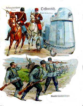 Die offizielle Kriegspropaganda Deutschlands und Österreich-Ungarns im ersten Weltkrieg war auffallend zurückhaltend. Man orientierte sich an Art. 22 der Haager Landkriegsordnung von 1907. Demgemäß stellte die oberste deutsche Zensurstelle klar: "....Aufforderungen zu barbarischer Kriegsführung und Vertilgung fremder Völker ist abstoßend...Ähnliche Aufforderungen der feindlichen Hetzpresse sind für ein gleiches Verhalten unsererseits keine Entschuldigung..." ( vgl. die Bilder oben mitte und rechts, die dieser Direktive gerecht wurden).