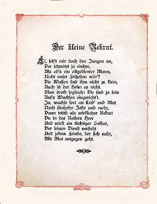 Im zweiten deutschen Kaiserreich hatte sich das Militär zu einem dominierenden gesellschaftlichen Faktor entwickelt. Die oft zitierte Frage: "Haben Sie gedient?" eröffnete einem Mann die Möglichkeit, sich als wertvolles Mitglied der Gesellschaft zu erkennen zu geben. Die Einbeziehung von Kindern in dieses militaristische Denken spiegelte die gesellschaftlichen Wertvorstellungen wider. Dementsprechend gehörte 'Der kleine Rekrut' zu einem Standardthema von Bilderbüchern und Lesefibeln (Mitte). Unten links: Im Manöver, Ein Soldaten- Bilderbuch für deutsche Knaben, undatiert, vor 1914. Unten rechts: Das deutsche Heer ein Bilderbuch für deutsche Knaben, Verlag von Gustav Weise, Stuttgart, undatiert, vor 1914. |