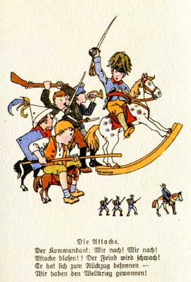 Passend zu den Bilderbüchern mit dramatisch-gefälligen Bildern von deutschen Kriegserfolgen gab es jede Menge Kriegsspiele, angefangen vom Schützengrabenspiel über Soldatenfiguren bis zum unterhaltsamen und belehrenden Weltkriegsspiel. |